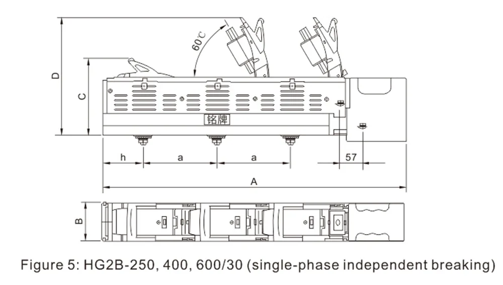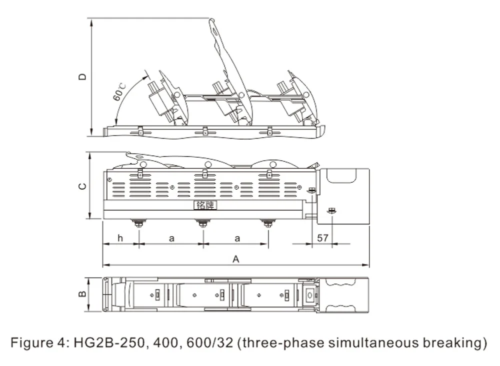 Dimensiones generales y de instalación del interruptor-seccionador con fusible en línea HG2B-160~630A.