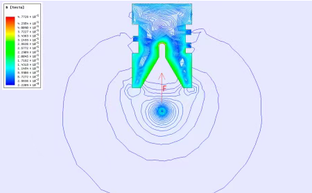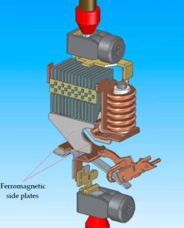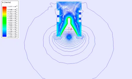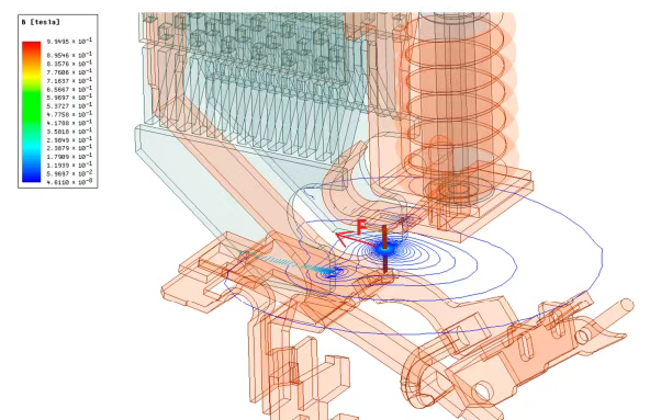 ● Curvas azules en forma de bobina: Líneas de campo magnético alrededor de la corriente del arco, lo que indica que el campo magnético alrededor del arco está distribuido de manera desigual pero está sesgado por la geometría del conductor y los componentes ferromagnéticos.