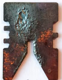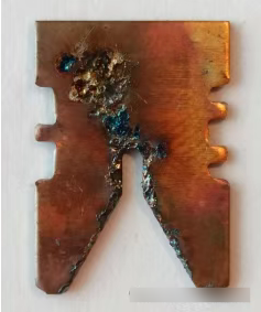 La forma de onda es más intensa con un zumbido evidente después del truncamiento. La cámara de arco muestra un severo ennegrecimiento y acumulación de material fundido.