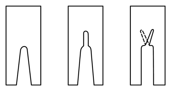 Las formas de apertura típicas en la entrada de las rejillas de desionización en los conductos de arco de los interruptores automáticos de bajo voltaje controlan la ruta de entrada, el alargamiento y la división del arco mediante un diseño geométrico. Los tres diagramas corresponden a configuraciones comunes de CA y CC respectivamente: