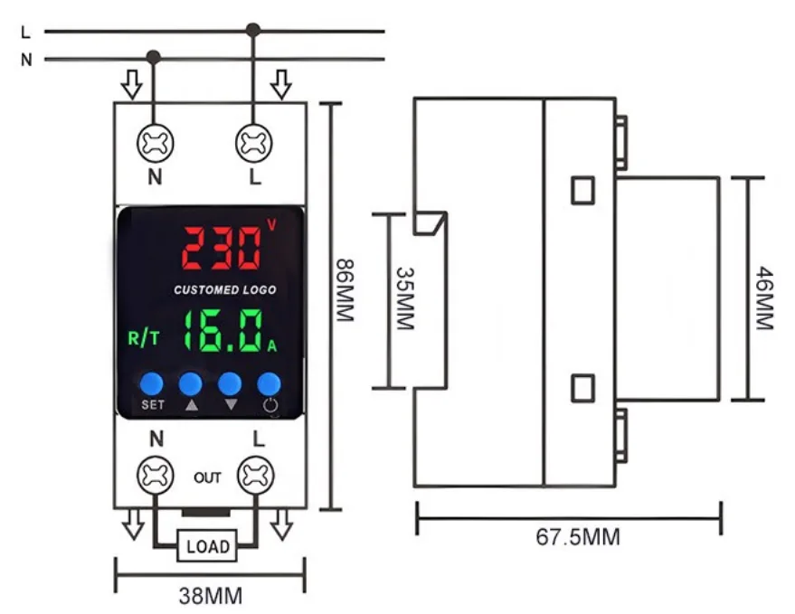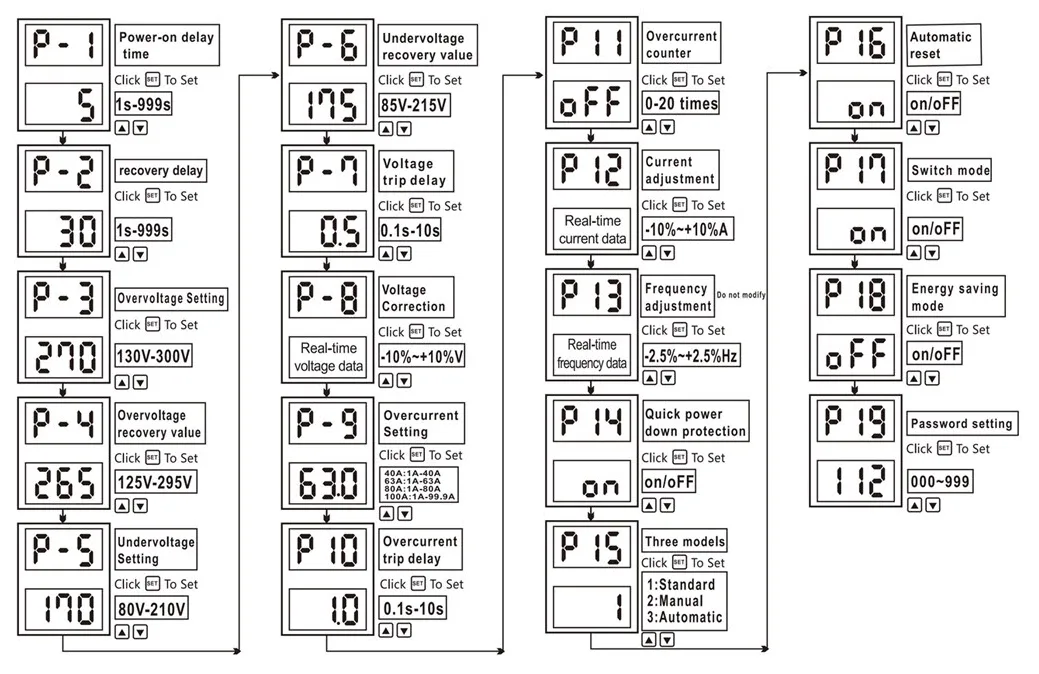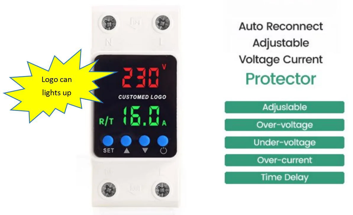 El valor de sobretensión, el valor de subtensión y el valor de protección de corriente se pueden configurar manualmente (presione y mantenga presionada la tecla de configuración durante 5 segundos para ingresar al menú). ¡También puede configurar el modo de visualización e incluso personalizar la visualización del logotipo de su empresa!