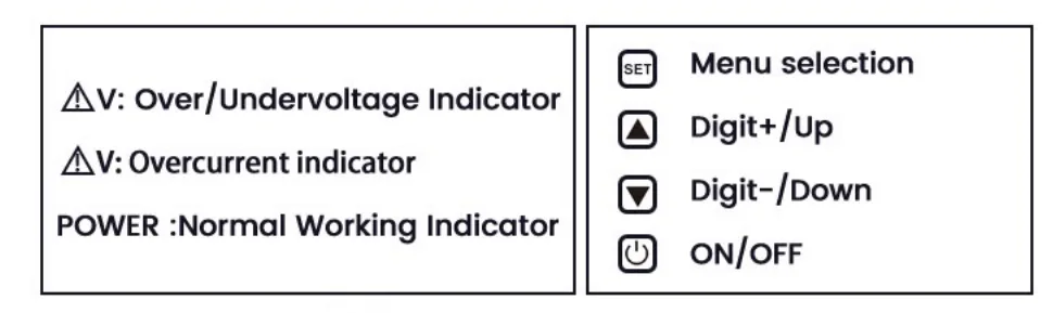 Mantenga presionadas las teclas "Set" hacia abajo durante 5 segundos para ingresar al estado SET, presione las teclas arriba y abajo para modificar el sobrevoltaje, subtensión y corriente, presione la tecla SET para guardar.